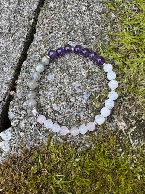 Created using 8mm lava beads, 8mm Adgate, Howlite, Labradorite, Amethyst, Moonstone, Rose Quartz rondelles and 3mm silver beads.